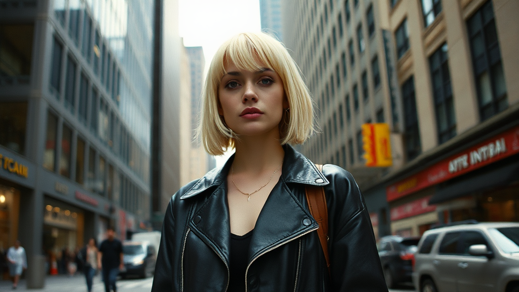 Street style photo of a grunge-inspired woman in the bustling streets of 1990s Manhattan, standing confidently before a metallic high rise, her platinum blonde hair in a classic 90s bob reminiscent of Carly Norris from the movie Sliver, captured in soft natural light, shot on vintage film stock for an authentic feel, with the urban backdrop adding texture and depth to the scene, creating a nostalgic yet edgy vibe.