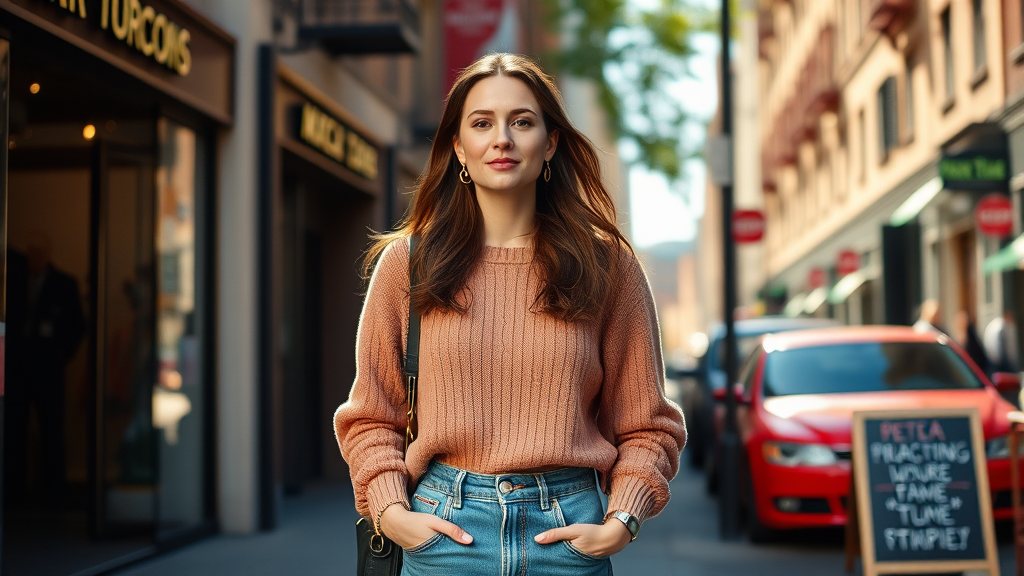 Street style photo of a woman in a chic preppy sweater paired with vintage high-waisted jeans, basking in the warm natural light of a Soho afternoon, captured on Agfa Vista 200 film, showcasing vibrant colors and subtle grain, set against a backdrop of trendy boutiques and bustling streets, 4k resolution, aspect ratio 2:3, high-quality detail.