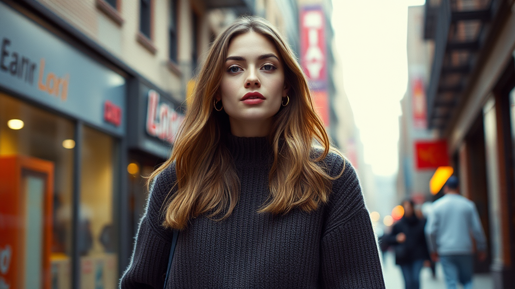 street style photo of a woman in a chic preppy sweater, soft natural lighting, vibrant soho backdrop, captured on Agfa Vista 200 film, 4k resolution, slender aspect ratio 2:3, enhanced with subtle artistic flair while maintaining the essence of the original scene