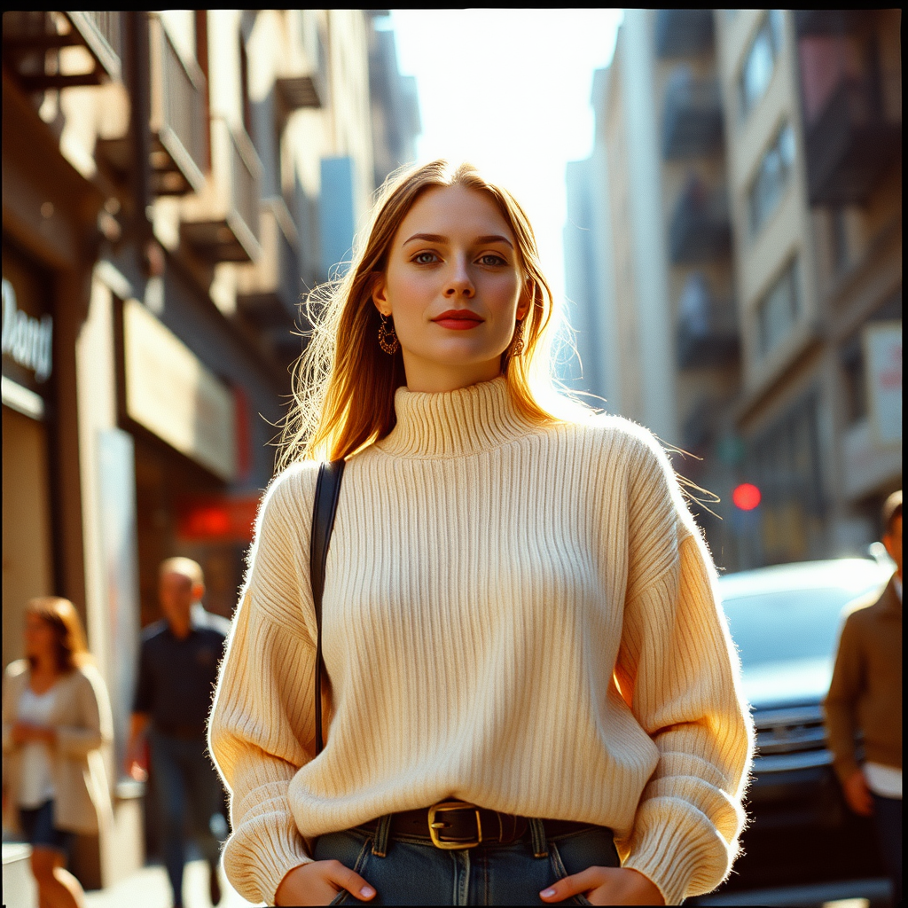 street style photo of a woman wearing a chic preppy sweater, bathed in soft morning light, bustling soho backdrop, captured on vintage Agfa Vista 200 film, ultra high definition 4k resolution, aspect ratio 2:3, emphasis on vibrant colors and lively atmosphere.