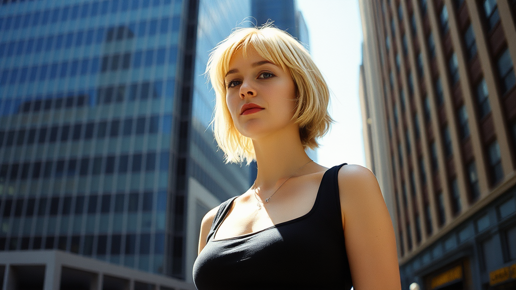 Street style portrait of a grunge-inspired woman in 1990 Manhattan, standing before a sleek high-rise, short blonde hair in a 90s bob, reminiscent of Carly Norris from Sliver, natural afternoon sunlight, captured on Kodak Gold 200 film, emphasizing the city's vibrant energy and style.