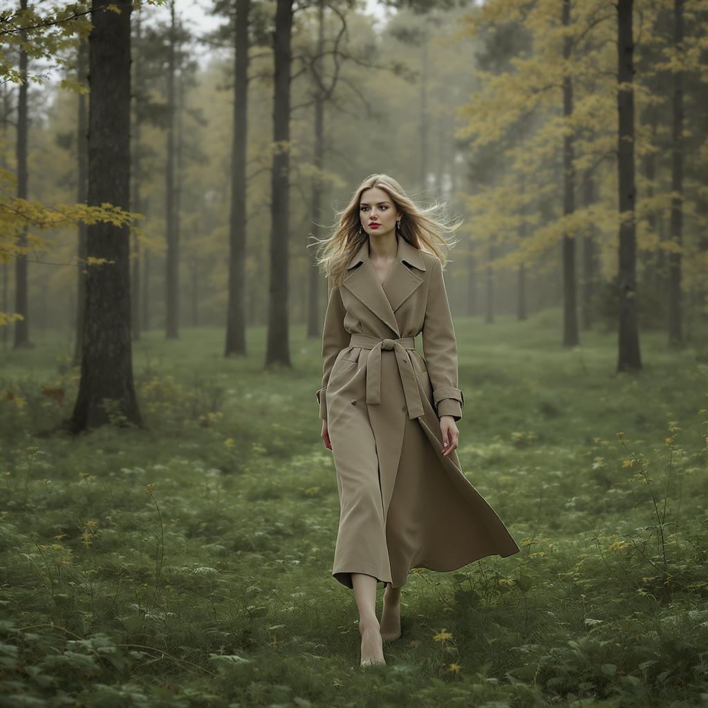 View this AI-generated image featuring a woman strides elegantly across a verdant expanse draped in a luxurious earthy trench coat reminiscent of a vogue fashion shot she is set against the backdrop of a serene swedish forest evoking the cinematic allure of dune 2020 her look channels the enchanting