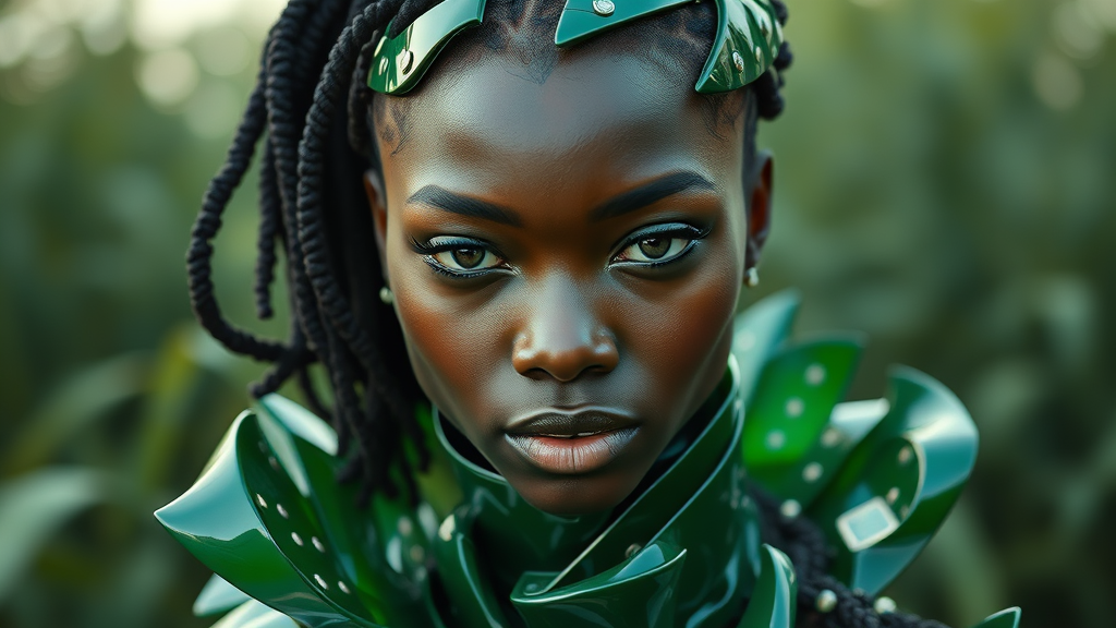Striking black female model gazing purposefully, adorned in avant-garde attire featuring intricate plastic and latex elements, with abstract silhouettes and asymmetric techno embellishments. Dominantly showcasing a verdant palette, captured in exquisite 4k resolution, framed as a medium shot. The style echoes the innovative genius of Iris van Herpen, blending futuristic fashion with cinematic flair.