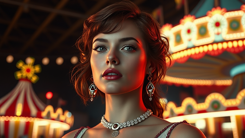 Striking retrofuturistic portrait of a woman at the grand circus, highly detailed and hyperrealistic, created with cutting-edge CGI and octane rendering, reminiscent of cinematic photography infused with a retro color palette. Utilizing ProPhoto RGB for vivid color expression. The scene captures a surreal yet tangible quality, reminiscent of vintage 35mm photography, with a touch of whimsical elegance and dreamlike ambiance.