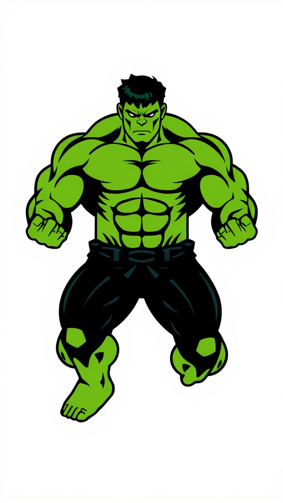 Strong and symmetrical Hulk icon design, featuring bold lines and a flat color palette, highlighting his muscular build and iconic green skin, with creative geometric elements integrated into the composition to add a modern twist.