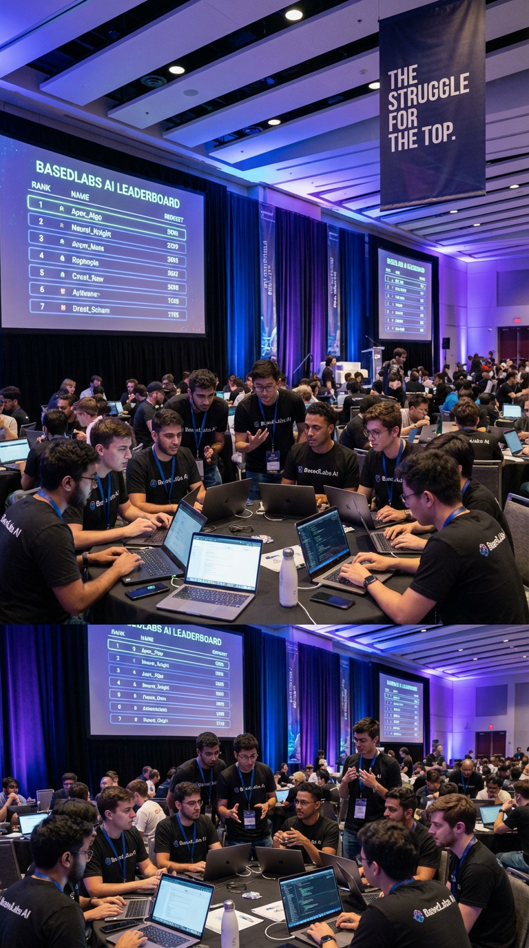 A dynamic scene captures students intensely focused on laptops during an AI competition, with a large screen displaying the 'BasedLabs AI Leaderboard'. The atmosphere is one of focused collaboration and competitive spirit in a modern conference setting.