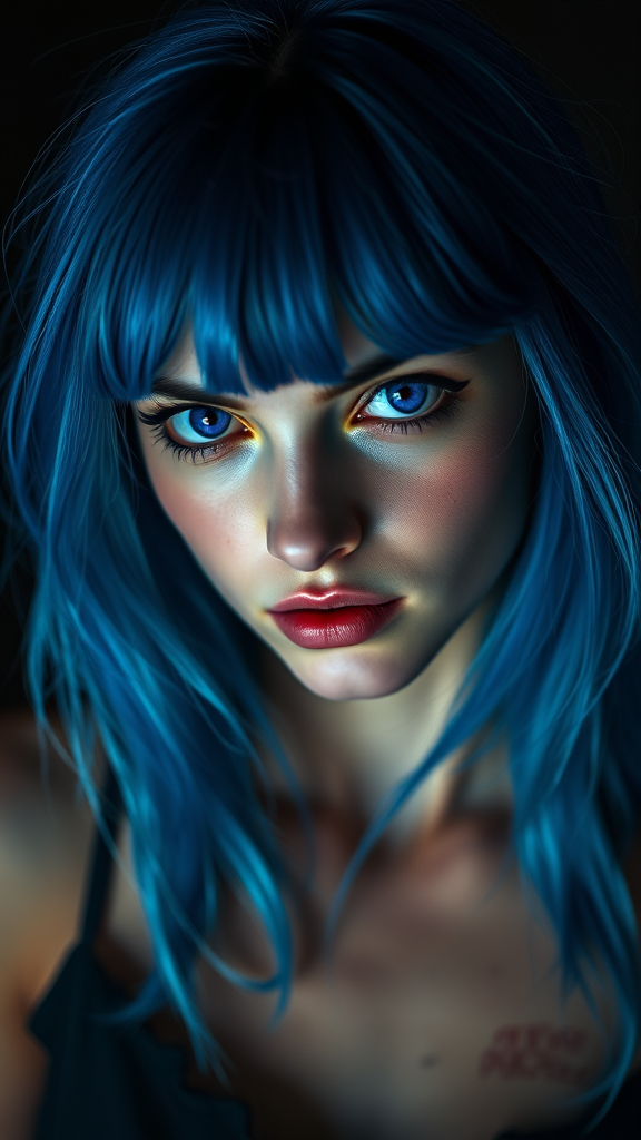 Studio full body portrait of a young woman with striking blue hair and a mischievous look, her vivid violet eyes detailed and expressive, shot in dim lighting to accentuate an ultra-realistic and hyper-detailed effect. Captured through the lens of a Leica SL2 at f/5.6 using a 105mm lens, the image is styled with the dramatic flair of Irving Penn and Annie Leibovitz. The final touch is seamlessly retouched to enhance the photorealistic quality, creating a captivating blend of elegance and mischief.