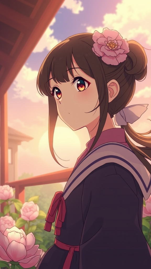 Studio Ghibli-inspired anime, Scarlet Peony Express, 19-year-old daughter, heir of rose hues, rose-tinted gaze.