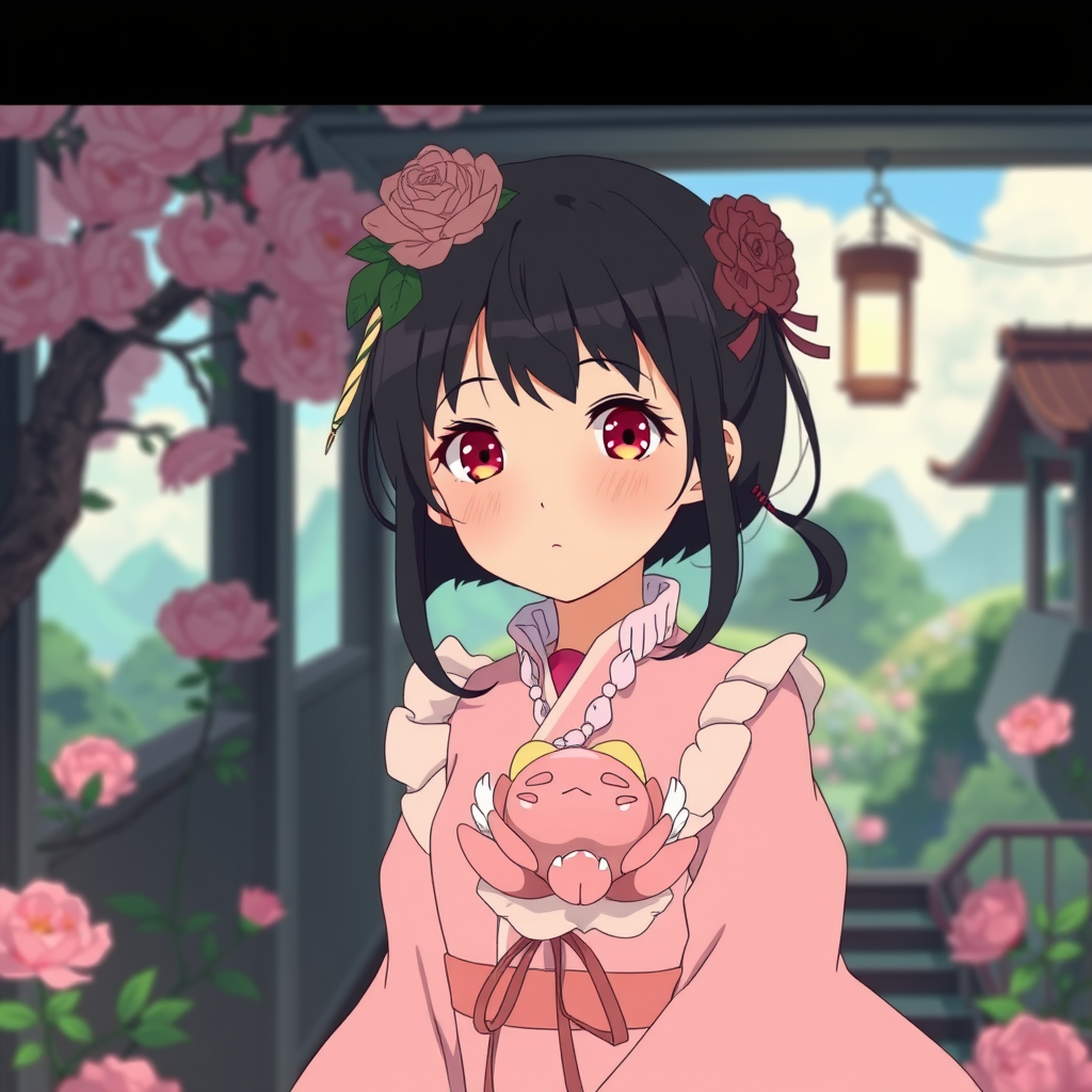 Studio Ghibli-inspired anime scene, Scarlet Peony Express/19-year-old daughter, rose-toned heiress, eyes the color of blooming roses, ethereal landscapes with whimsical creatures, magical realism woven into every petal of her destiny.