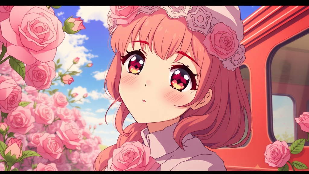 Studio Ghibli-inspired anime, the Scarlet Dahlia Express, 19-year-old daughter, heir adorned in rose hues, eyes shimmering with the color of roses.