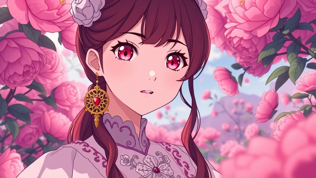 Studio Ghibli-inspired anime world, featuring a 19-year-old daughter known as the Crimson Peony, heir of the rose-tinted realm, her eyes shimmering with the hues of a blooming rose garden.