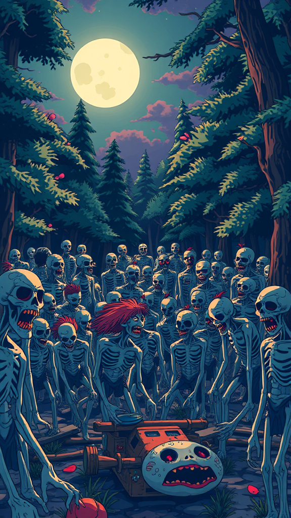 Studio Ghibli-inspired scene, a hauntingly beautiful zombie horde designed in the distinctive style of Hayao Miyazaki, vibrant yet eerie with retro anime aesthetics, showcasing a harmonious blend of horror and whimsy, set in a lush, enchanted forest under a moonlit sky, where the undead wander with a surreal dreamlike quality.