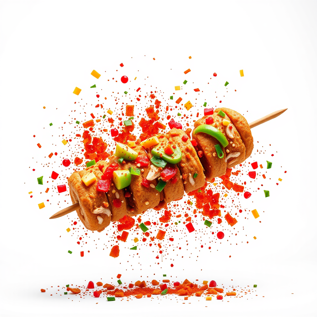 Studio photography, colossal splash of colorful condiments on kebab, bright white lighting, professional studio setup, ultra-high-definition rendering, impeccably detailed, intricate textures, isolated against a pristine white backdrop, 8k quality, stock image style, enhanced professional color grading, vibrant detail emphasis, vertical orientation.