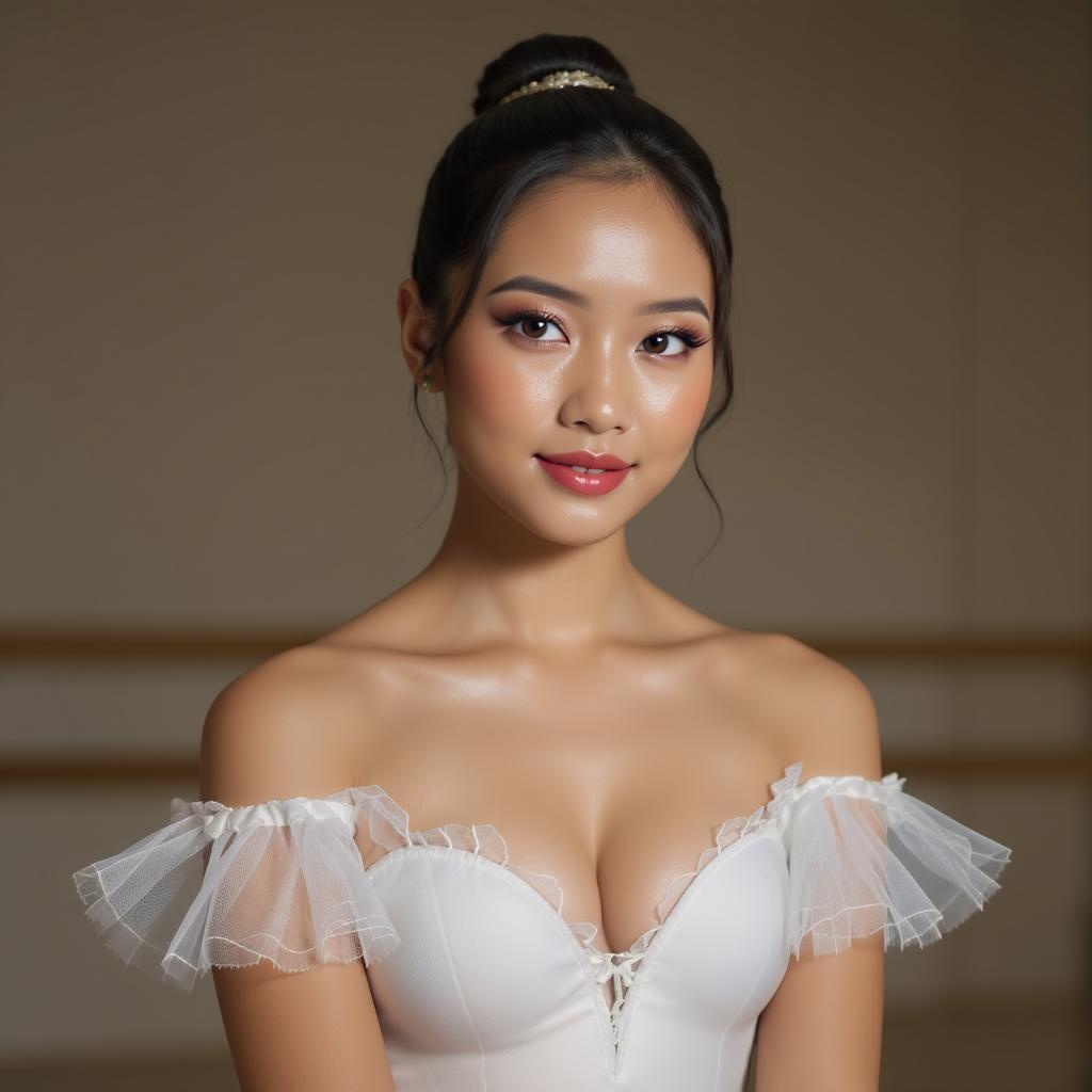 Studio portrait of a beautiful Filipina mestiza in ballet clothing, graceful makeup, taken indoors, with complex and sophisticated details, using photometric lighting that enhances symmetry, captured in optimal quality, ultra high-resolution, 8k.