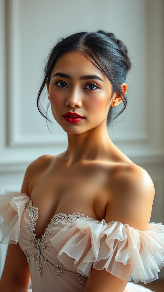 Studio portrait of a beautiful Filipina mestiza in graceful ballet attire, with delicate makeup, captured indoors, showcasing an intricate and elegant setup with detailed, photometric lighting; symmetrical illumination highlights her features. The photo boasts exceptional quality, presented in ultra high-resolution, 8k, enhancing the refined essence of the composition.
