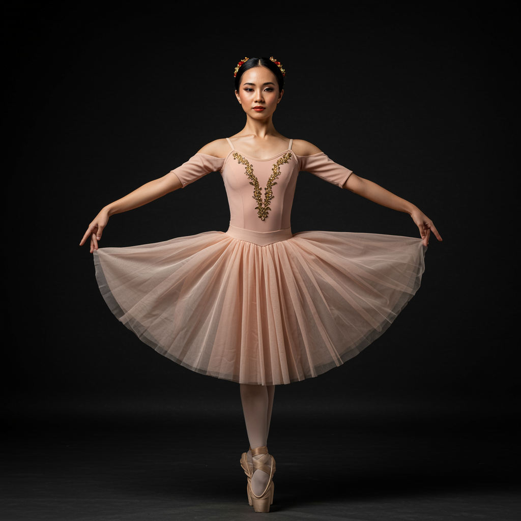 Studio portrait of a graceful Filipina mestiza dressed in elegant ballet attire, with soft makeup, captured indoors, showcasing intricate and sophisticated details, illuminated by finely balanced photometric lighting, featuring symmetrical light distribution, rendered in superior quality, ultra high-resolution, 8k.