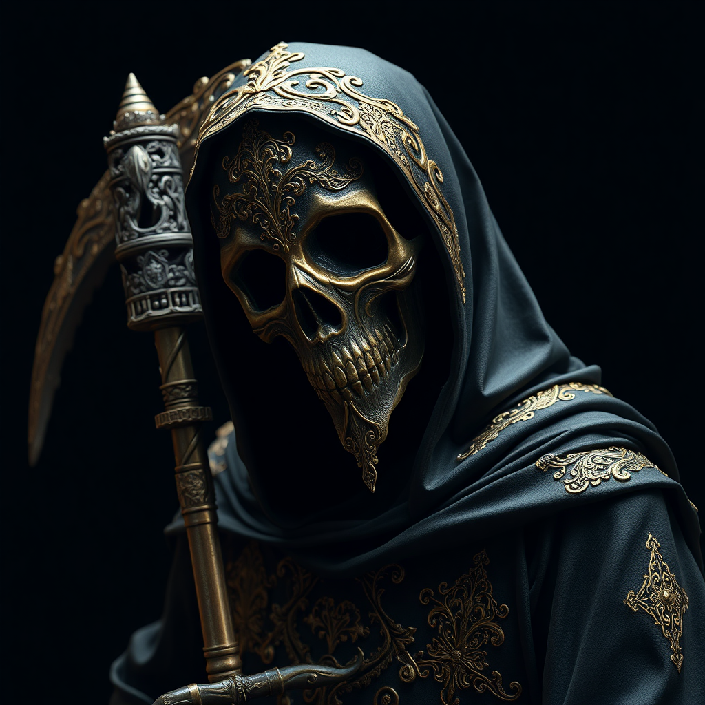 Studio portrait of a mythical death figure adorned in intricate golden filigree, set in a low key, high contrast environment. The scene is crafted with attention to detail reminiscent of zbrush rendering, a fusion of nrealfixer and cgi artistry, resembling a vivid painting or digital illustration. The image embodies a blend of realism and fantasy, capturing the essence of an award-winning art piece with slight creative variations to the traditional grim reaper depiction.