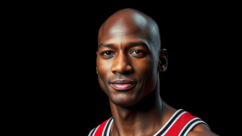 Studio portrait of a renowned basketball athlete, featuring a striking resemblance to Michael Jordan, captured under professional studio lighting with unparalleled clarity in 8k resolution. The photograph showcases incredibly fine details and textures, isolated against a clean black background. The image is suitable for high-end commercial purposes, with expert-level color grading and precision in focus, emphasizing the athlete's iconic features.