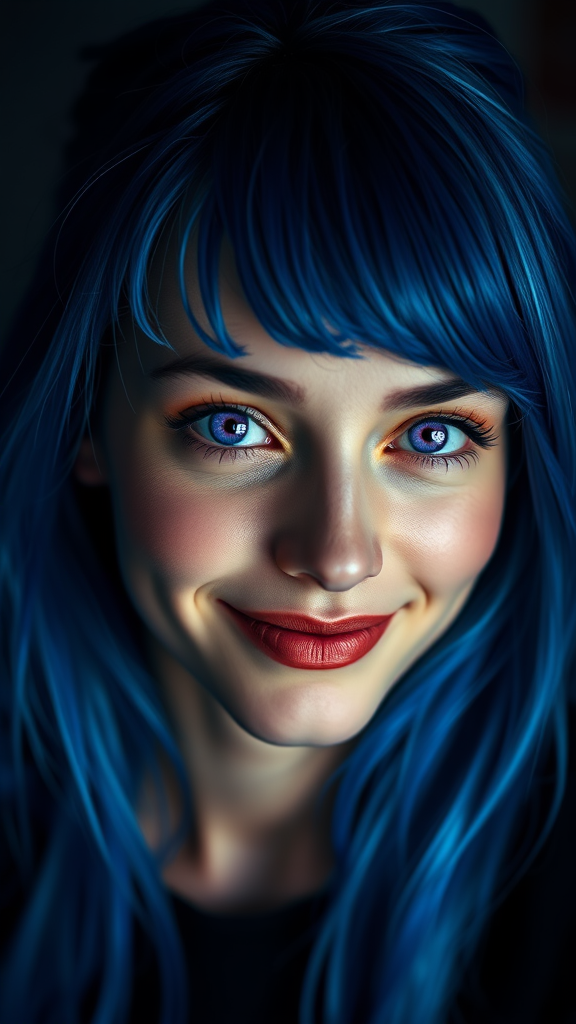 Studio portrait of a stunning young woman with striking blue hair, her eyes a vivid and mesmerizing violet, captured in a moment of playful mischief as she smirks at the camera. The lighting is softly dimmed, adding depth to the ultra-realistic and hyper-detailed photograph. Shot with a Leica SL2 and a 105mm lens at f/5.6, the image embodies the photographic styles of both Irving Penn and Annie Leibovitz, expertly retouched for an impeccable finish. Her expression and the texture of the image create an exquisite balance of elegance and intrigue.