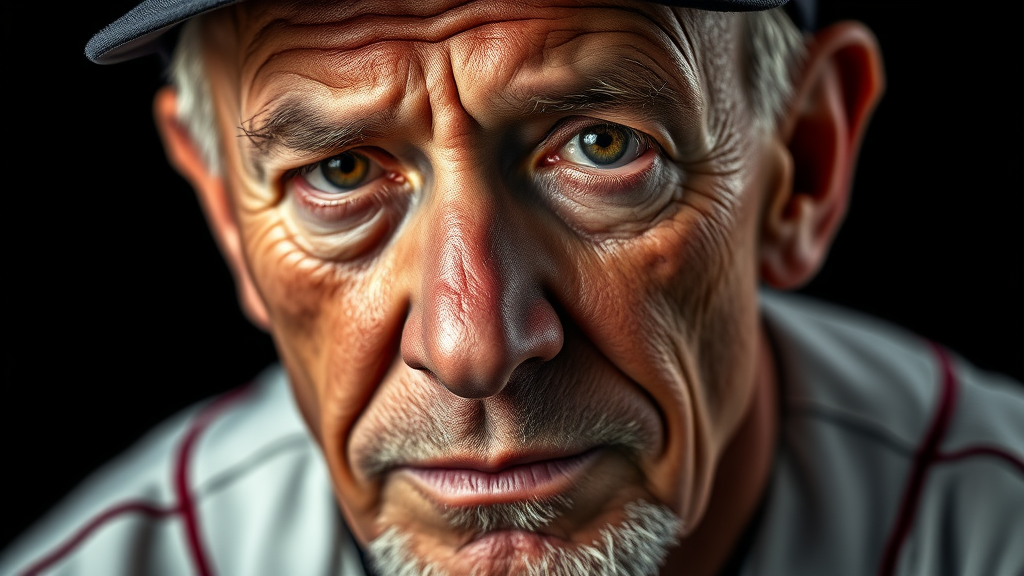 Studio portrait of a weary, seasoned baseball player with a deeply expressive face, captured with studio lighting and 8k resolution. The image is rendered with exquisite details, showcasing every wrinkle and texture, set against an isolated black background. The photograph has professional color grading for a polished, stock photo quality, highlighting the character and history in the subject's eyes.