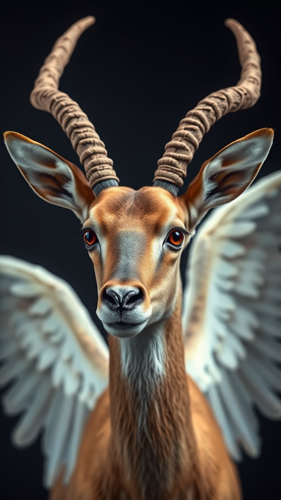 Studio portrait photo of an exquisitely detailed saiga antelope with ethereal angelic wings, gazing playfully at the lens with captivating amber eyes, showcasing a hint of mischief. The image is masterfully detailed, featuring precise rim lighting that accentuates its graceful form. Ultra-realistic and photorealistic quality, reminiscent of works by renowned photographers Felix Kunze and Annie Leibovitz, with retouching finesse akin to that of Pratik Naik. Captured with a Canon DSLR at f/2.8, this portrait combines artistic lighting and intricate detail to create a striking, enigmatic presence.