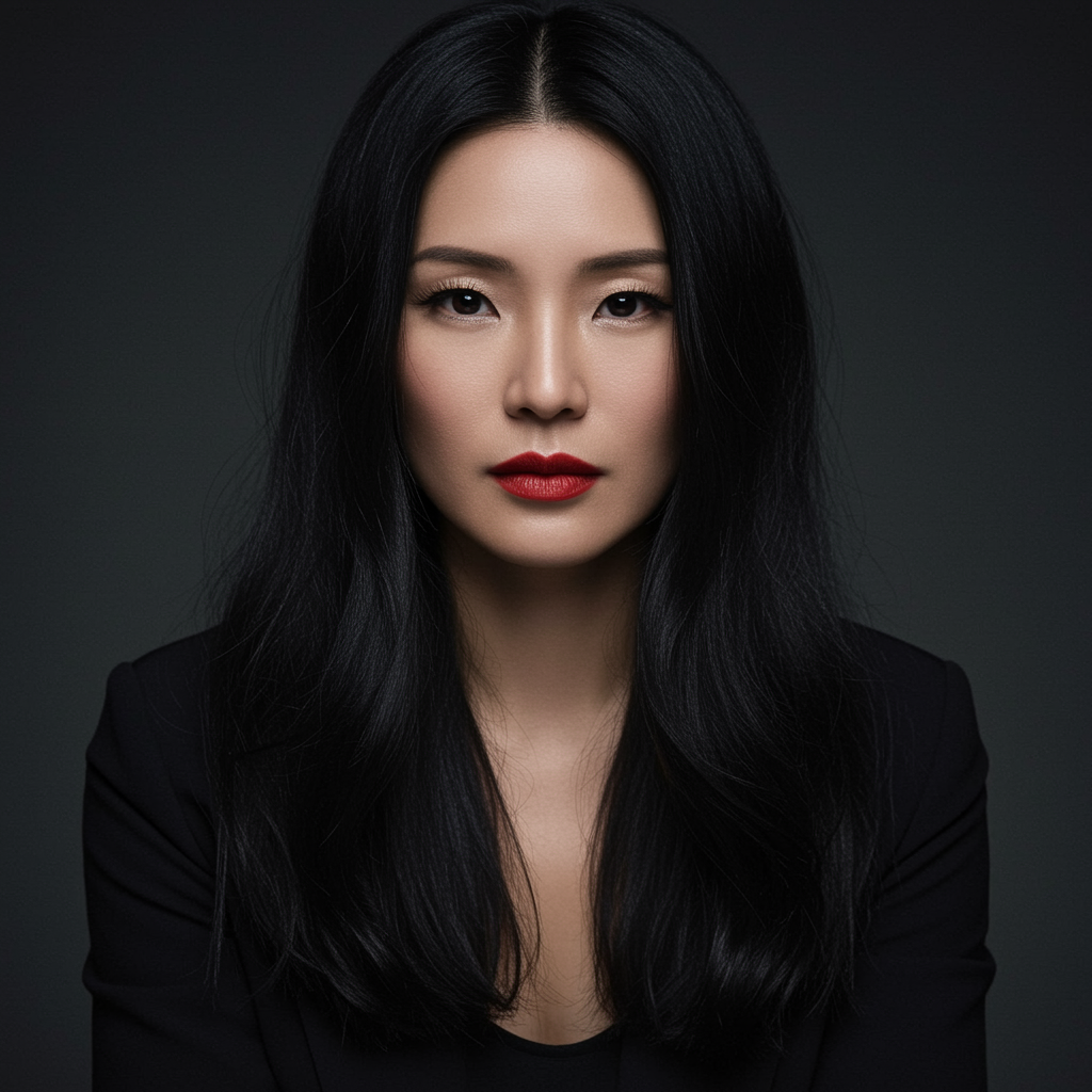 A high-quality studio shoot captures the portrait of a captivating Spanish lady. Her jet-black hair cascades elegantly, framing her serene face with a hint of mystery. She exudes a simply elegant allure, reminiscent of classic film stars, with a touch of film grain adding timeless sophistication. The portrait is taken with a Nikon D850, blending cultural beauty with an Asian influence, drawing parallels to a graceful Chinese aesthetic in her poised expression.