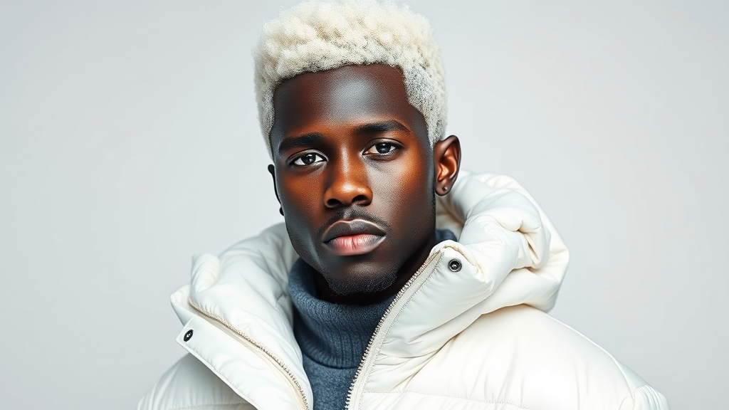 Stunning 26-year-old Afro model with striking white hair, showcasing a milky Adidas winter puffer jacket. Inspired by Kanye West's design aesthetic, the scene highlights intricate and detailed textures on a pristine white background, captured in high resolution (4K) for visual depth and clarity.