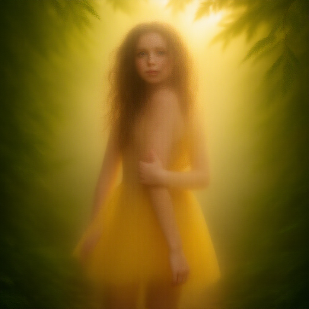 Stunning 4k masterpiece of a girl with freckles wearing a delicate yellow dress, nestled in the lush forest under a fern canopy, illuminated by a warm, golden light above. Her graceful form is enveloped in bright sunlit hues, captured with a shallow depth of field and soft atmospheric tones. The scene is a powerful portrait of perfect anatomy in high resolution, exhibiting the finesse of professional photography with a cinematic dynamic angle. Surrounding light creates a gentle haze, enhancing the enchanting ambiance with cinematic lighting and subtle mist wafting through the scene.