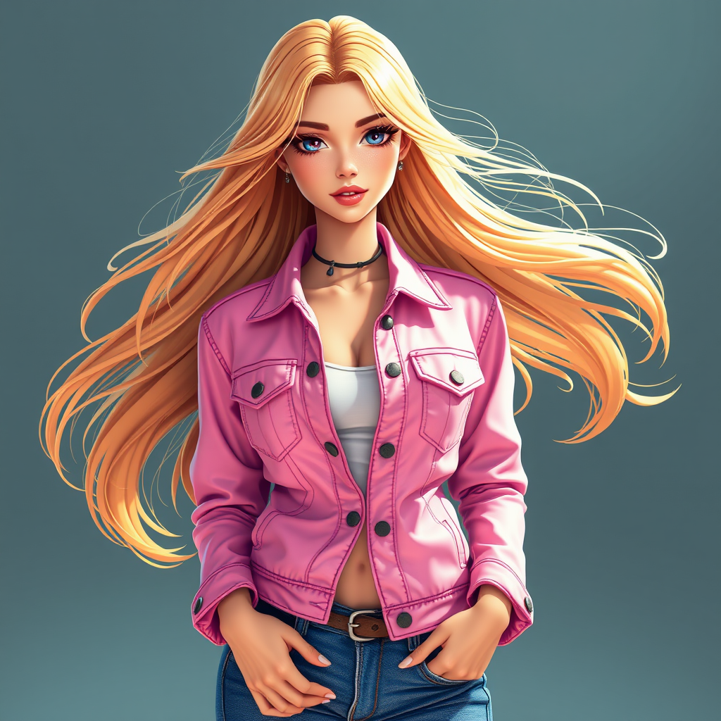 Stunning American woman with flowing golden hair, wearing a trendy pink denim jacket and stylish blue jeans, depicted in vibrant anime-inspired 3D, rendered in 8k with an ultra-realistic engine, capturing expressive style and artistry.