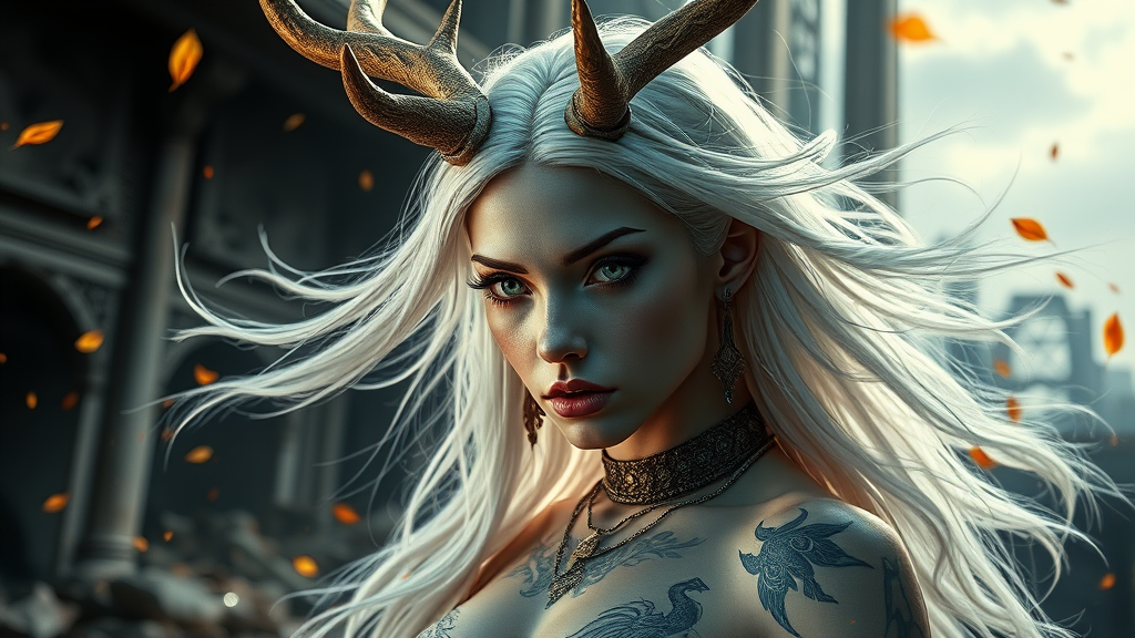 Stunning and ethereal deity-like girl with striking deer horns, a radiant aura, and flowing white hair. Her pale skin contrasts against an expression of both fury and hunger, embodying a captivating demoness. Delicate tattoos and intricate jewelry embellish her form, exuding an irresistible charm. Set against an apocalyptic backdrop, the scene is alive with glowing fire particles and gently falling leaves. Mesmerizing eyes, rich with detail, capture the viewer's gaze. This masterpiece blends art and photography, presenting an exquisitely detailed game character against stunning ruins with volumetric light casting an otherworldly glow. Inspired by the styles of Sophie Anderson and Artgerm, the composition invites the viewer into a mystical and immersive visual narrative.