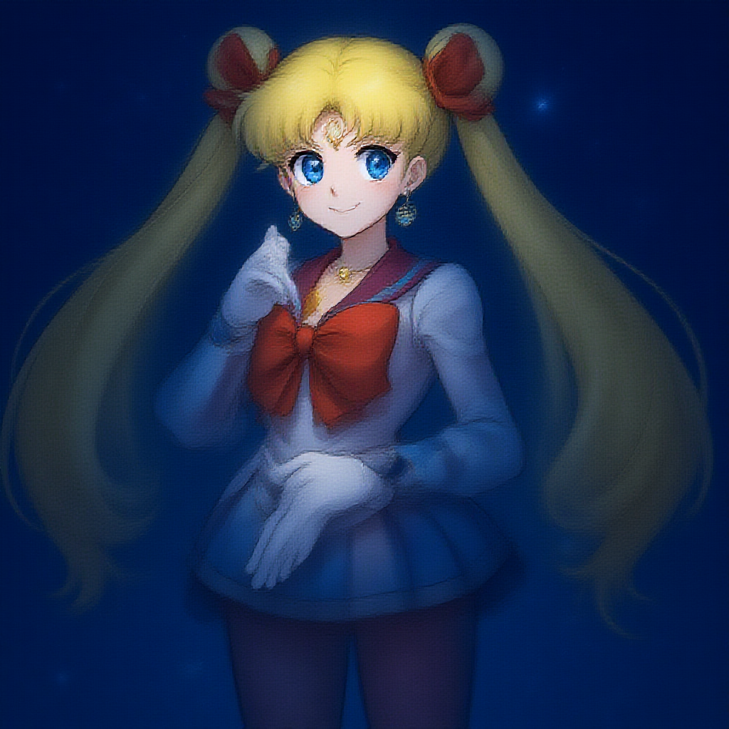 Stunning and high-quality vision of Super Sailor Moon under a starry night sky, bathed in moonlight. She stands adorned in a dazzling sailor senshi uniform with a multicolored skirt and vibrant multicolored clothing. Her deep blue eyes shine brightly, complementing her elegant white gloves and crescent moon earrings. Her long hair cascades gracefully, adorned with beautiful ornaments. A red bow with a heart brooch accentuates her look, while a heart necklace rests gently against her chest. Her tiara gleams in the galaxy-lit background, paired with bright yellow and crescent motifs. Donning stylish knee-high red boots, she embodies both power and grace against a mesmerizing cosmic backdrop.