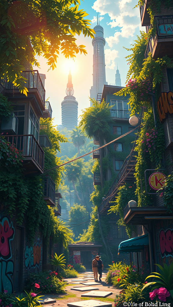 Stunning anime painting of a solarpunk summer's day, inspired by the styles of Tim Okamura, Victor Nizovtsev, Greg Rutkowski, and Noah Bradley, capturing a vibrant, sunlit scene. The artwork features lush greenery intertwined with futuristic architecture, where colorful graffiti art meets nature. The fine details and 8k resolution bring out a masterpiece full of intricate elements, playing with the golden ratio to create a harmonious composition. This colorful and lively depiction is trending on art platforms, merging traditional and modern aesthetics.