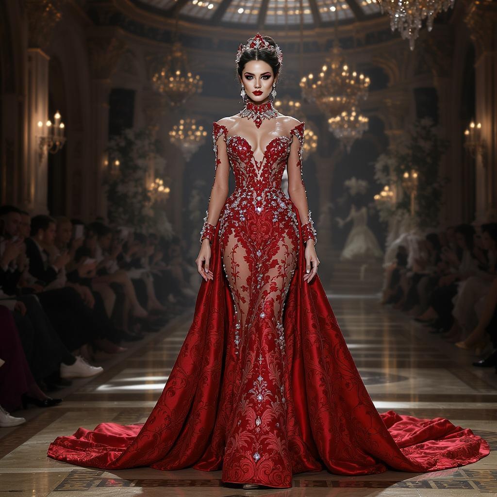 Stunning anyataylorjoy adorned in a breathtaking red gown embellished with rubies and glittering diamonds, featuring intricate and exquisite detailing. The dress is crafted from luxurious soft silk, showcasing a rich, detailed brocade texture. Set in an elegant Sci-fi Victorian great hall, the scene captures the essence of a high-fashion runway show. The gown, with its sophisticated turtleneck design, whispers bridal elegance and wedding photography allure. Her radiant beauty is highlighted by ultra-realistic, cinematic lighting, reminiscent of Peter Mohrbacher's artistic style. Rendered in full body symmetry, the scene conveys a mesmerizingly detailed and captivating vision.