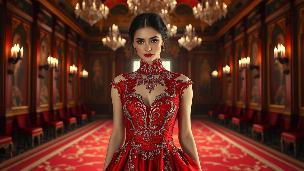 Stunning Anyataylorjoy in an exquisite red gown adorned with shimmering rubies and sparkling diamonds, featuring intricate detailing and luxurious silk texture, brocade patterns, on a fashion runway. Her beauty radiates in a Sci-fi Victorian-themed room, reminiscent of a grand hall. The elegant dress with a turtleneck design exudes bridal allure in a full-body composition, captured in wedding photography style. Symmetrical composition with ultra-realistic details, inspired by Peter Mohrbacher's artistry, enhanced by cinematic lighting.