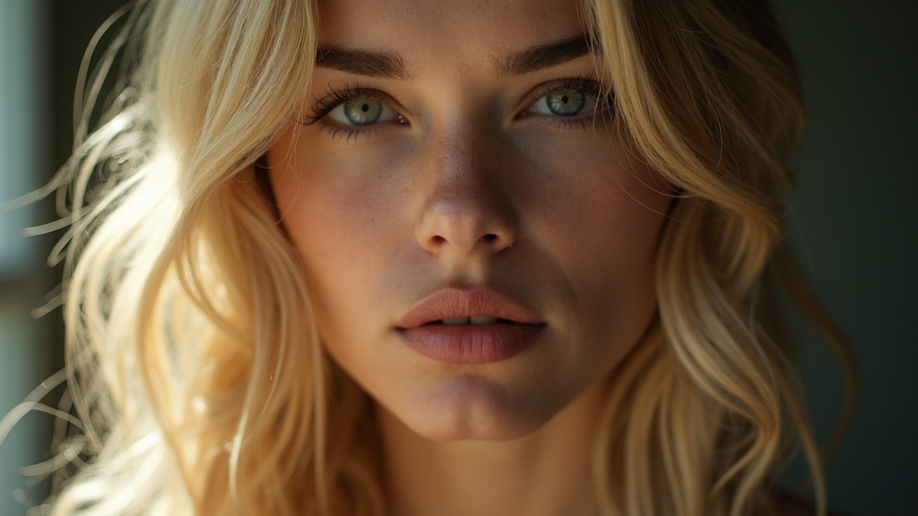 Stunning blonde-haired woman gazing directly ahead, captivating portrait, lifelike texture, deeply realistic, ultra-high-definition, intricate nuances, complete body view, striking features accentuated by subtle piercings, enveloped in gentle, dispersed light, limited focus depth, crystal-clear precision, hyperrealistic style, cinematic illumination, serene ambiance.