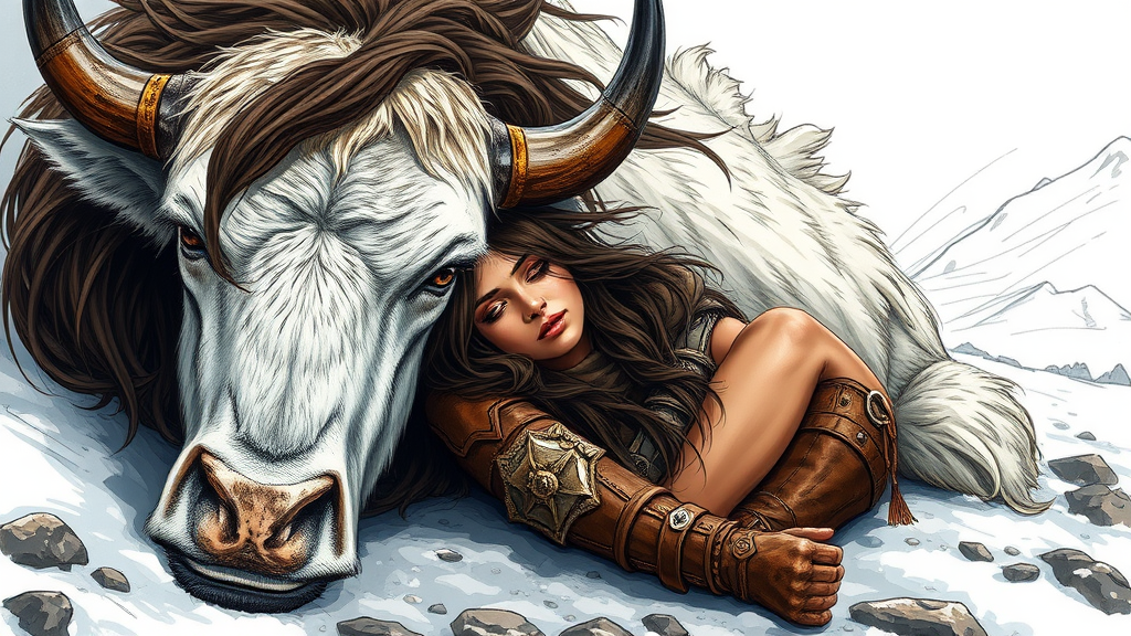 Stunning color sketch of a powerful and beautiful barbarian warrioress with intense brown eyes and long, windswept dark brown sable hair, peacefully asleep beside her majestic white war yak. Her skin is a warm tan, complemented by sturdy boots and armor made of brown leather and fur. The scene is set on a snowy mountain path, with a sketched background. Volumetric and dynamic lighting enhances the hyper-realistic, hyper-detailed fantasy artwork, creating a captivating dark romantic atmosphere.