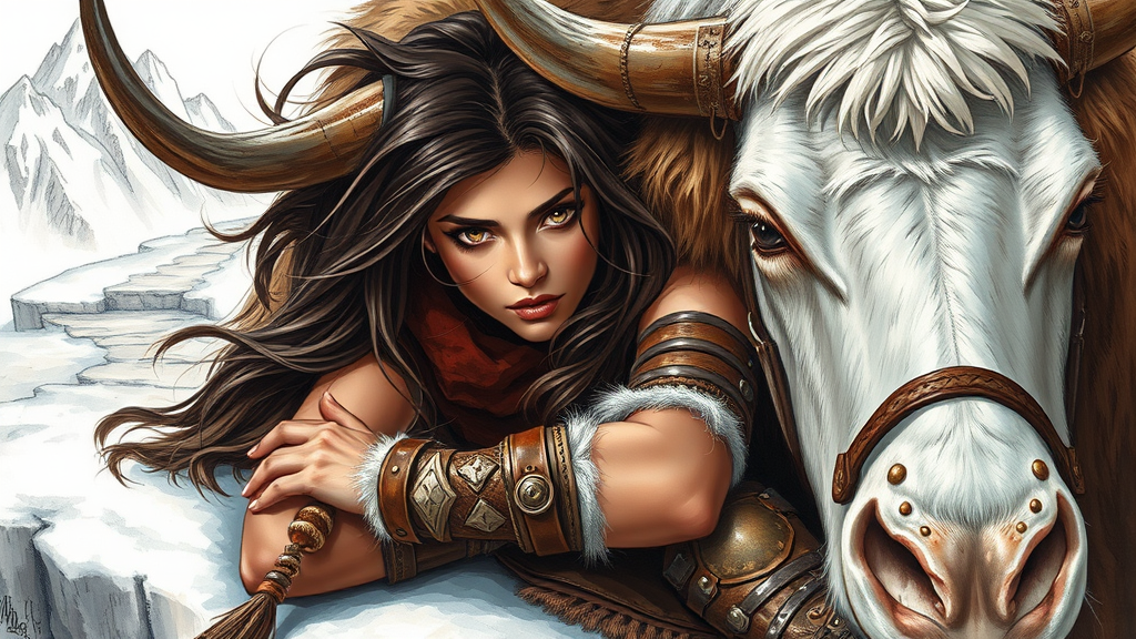 Stunning color sketch of a powerful and captivating barbarian warrioress with intense brown eyes and long, untamed dark brown sable hair, resting peacefully beside her majestic white war yak. Her skin has a warm tan hue, complemented by boots and armor crafted from rugged brown leather and fur. The background features a sketch of a snowy mountain ledge path, with dynamic and volumetric lighting enhancing the scene. The artwork is a photorealistic and hyperdetailed fantasy masterpiece, capturing a sense of dark romance and mystery.