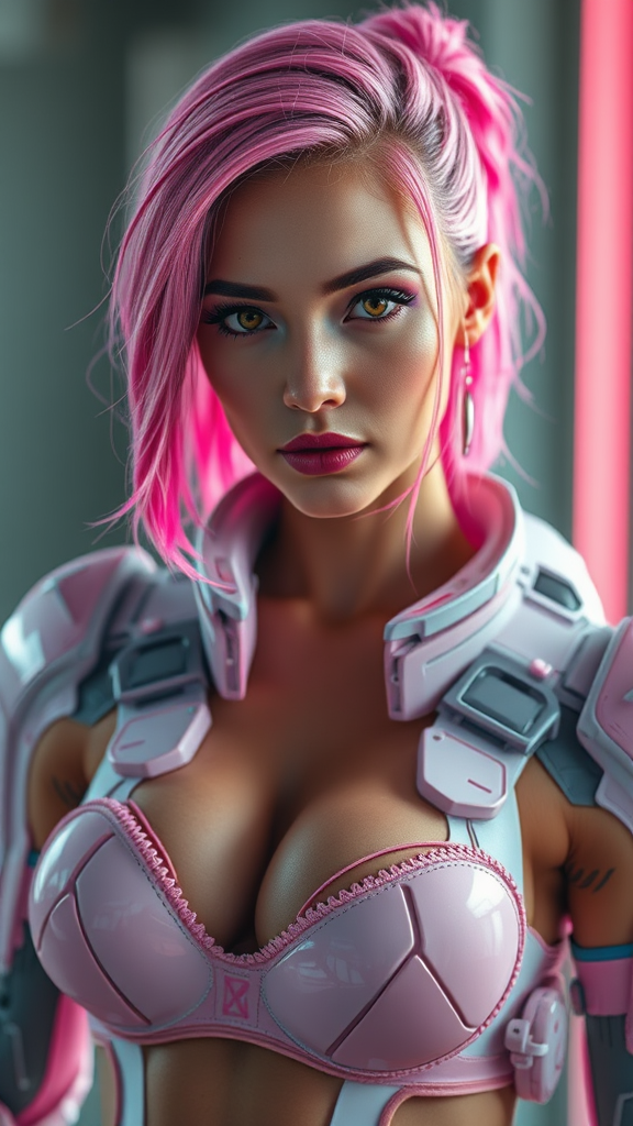 Stunning cyborg woman in sleek pink combat armor, vibrant pink hair, embodying a cyberpunk essence with high-tech, sci-fi elements. Her attire incorporates futuristic lingerie, exuding an attractive, flirtatious energy. Captured in a full-length portrait, she gazes directly at the viewer. The scene is bathed in soft, diffused lighting with a shallow depth of field and sharp focus, highlighting hyper-realistic, detailed skin. Presented in cinematic 8k quality using realistic, high-detail CGI, the image avoids low-resolution artifacts, capturing beauty in its finest details without distortions or anomalies.