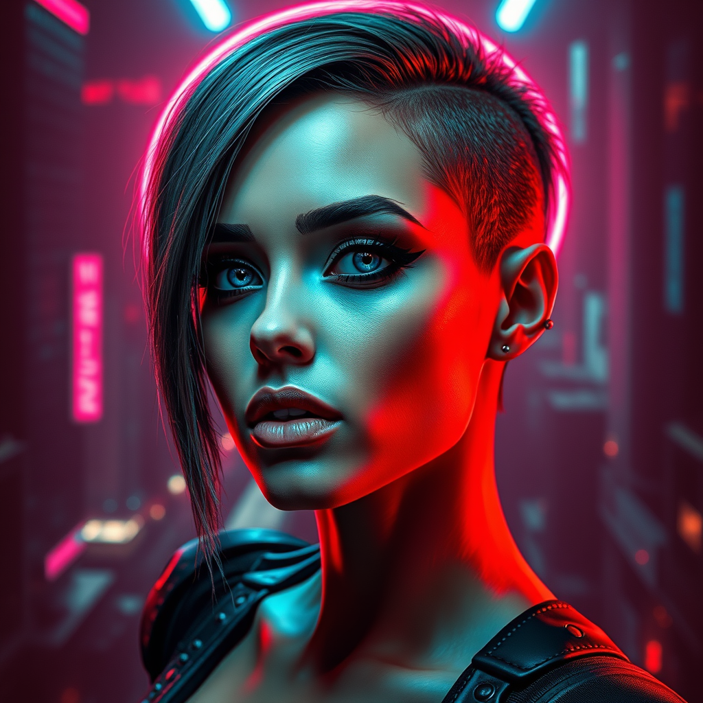 Stunning ethereal cyberpunk woman with striking black eyeliner, vivid blue eyes, and an edgy shaved side haircut, rendered in hyper-realistic detail, bathed in dramatic cinematic lighting, encircled by enchanting neon glows, set against the backdrop of a deep crimson cityscape.