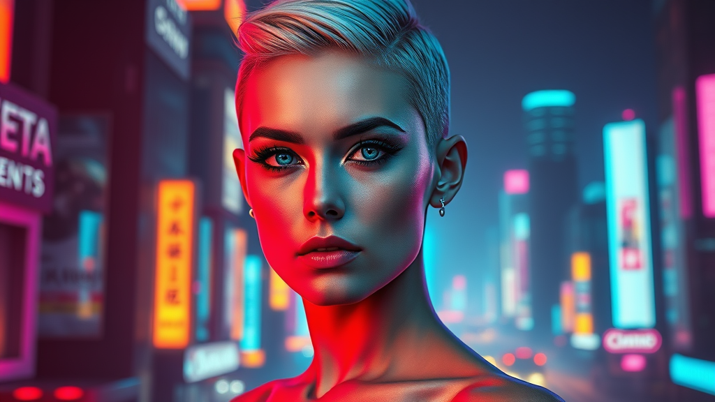 Stunning futuristic woman with alabaster skin and striking black eyeliner accentuating her bright azure eyes, sporting a bold shaved-side hairstyle, rendered in exquisite detail and basked in dramatic, film-like lighting; she stands amidst a pulsating neon landscape, where the magic of vibrant neon lights casts colorful reflections over a brooding maroon cityscape.