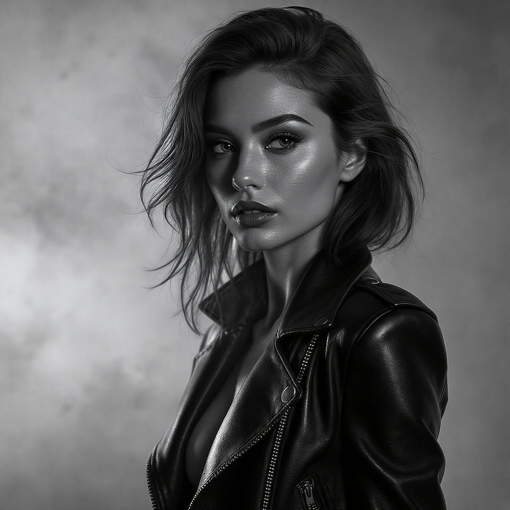 Stunning high-quality 4k photo, ultra-detailed black and white fashion editorial, striking realism, captivating dark-haired woman with a sleek leather jacket, radiant eyes, studio setting with dramatic lighting, elegantly poised, shallow depth of field creating a soft atmospheric vibe, compelling and dynamic portrait, perfect anatomy, professional photography with a cinematic perspective, light subtly illuminating from behind, capturing the essence of her beauty and strength.