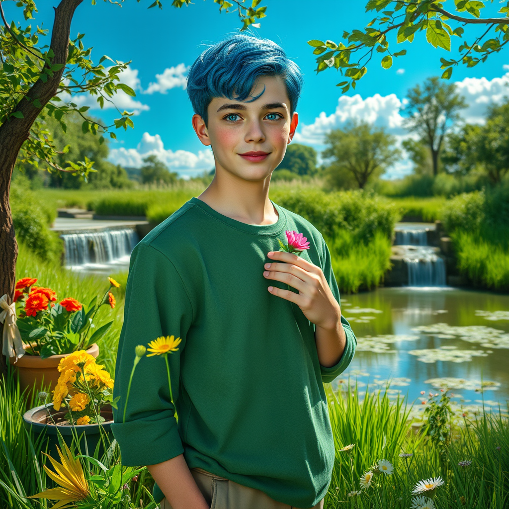 Stunning hyperrealistic HDR 8k highly detailed portrait photo of Abraham Simpson as a real human. Blue eyes, blue hair, subtle blush, looking at the viewer with a gentle smile. Outdoors in a vibrant green theme, surrounded by lush grass and a variety of flowers including yellow, red, pink, and white blooms. A potted plant sits nearby, and a ribbon tied to a tree adds a touch of whimsy. Sunlight filters through the trees, casting dappled shadows on a serene wetland. In the background, a small waterfall cascades into a clear pond. A vivid sky serves as a backdrop, with occasional fluffy clouds drifting by. He stands with one hand on his chest, the other holding a delicate flower, embodying a calm and relaxed demeanor. The setting is a picturesque blend of nature and tranquility, evoking a sense of peace. All elements harmoniously fit the scene, creating a captivating and immersive image without the distractions of a crowd or complex backgrounds.