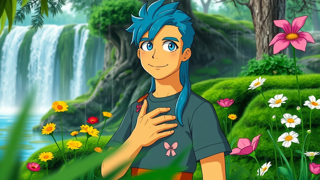 Stunning hyperrealistic HDR 8K highly detailed portrait photo of Abraham Simpson as a real human with blue eyes and blue hair, set outdoors with a blurred foreground. He stands in a green-themed setting, hand on his chest, surrounded by vivid flowers including yellow, red, white, and pink. The background features a waterfall and wetland scenery with rain and sunlight. Abraham has long hair and a smile, wearing a short-sleeved outfit with blush stickers and a ribbon. The portrait captures a sense of nature with elements such as moss, trees, and grass, amidst a serene blue sky. The image conveys a virtual-youtuber aesthetic with a nod to traditional media, capturing a moment of reflective serenity.