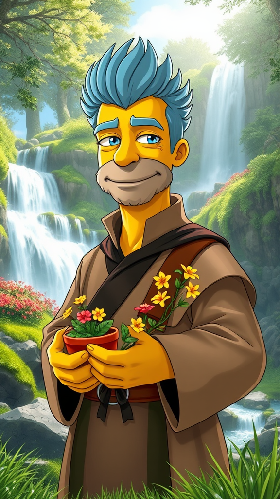 Stunning hyperrealistic portrait of a mature Abraham Simpson as a real human with blue eyes and hair, wearing a unique costume. He stands outdoors, surrounded by lush green scenery, vibrant flowers, and a cascading waterfall. Sunlight filters through the trees, casting a gentle glow on his face. He is holding a potted plant with delicate yellow and red flowers, and a ribbon adorns his wrist. His expression is one of warmth and wisdom, and he smiles softly while looking at the viewer. The composition captures a sense of peace and harmony with nature, enhanced by the presence of moss-covered stones and a serene blue sky. The photo is sharp, detailed, and high-resolution, accentuating the clarity of his facial features and the natural setting. Surrounding elements like grass, trees, and water are depicted with depth and richness, incorporating a subtle theme of virtual influences and subtle anime aesthetics.