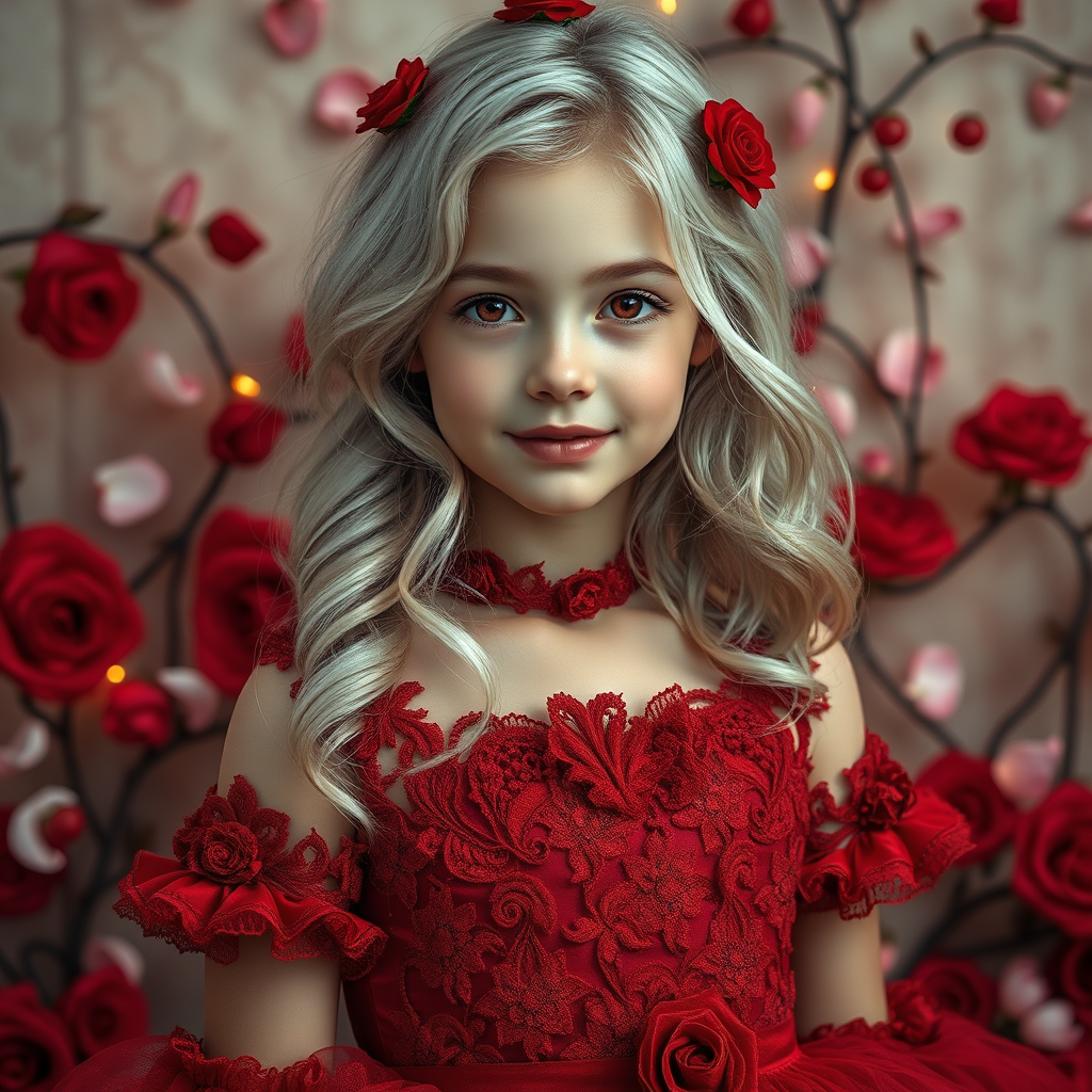 Stunning image capturing a single girl in a model shoot style, showcasing an award-winning composition. The girl is dressed in an exquisite party outfit, featuring a rich red dress adorned with intricate lace and abundant frills. She has wavy silver hair, fluttering gently, and captivating red eyes that add to her enigmatic allure. Her shy smile and elegant demeanor exude a mature feeling, while the background is embellished with fluttering petals and entwined rose vines, enhancing the romantic and dreamlike setting. The photograph is of brilliant quality, with perfect detail and sharp focus, rendered in 16k UHD HDR for breathtaking clarity. The overall ambiance is both surreal and captivating, embodying a fantasy-like charm.