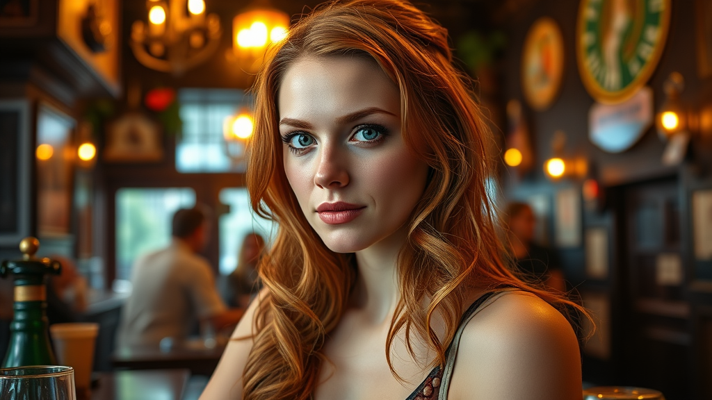 Stunning Irish redhead woman in a traditional pub, vibrant and colorful, captured with a cinematic touch, high-resolution, ultra-realistic, soft lighting accentuating her features, warm atmosphere, lively background, elegance in simplicity.