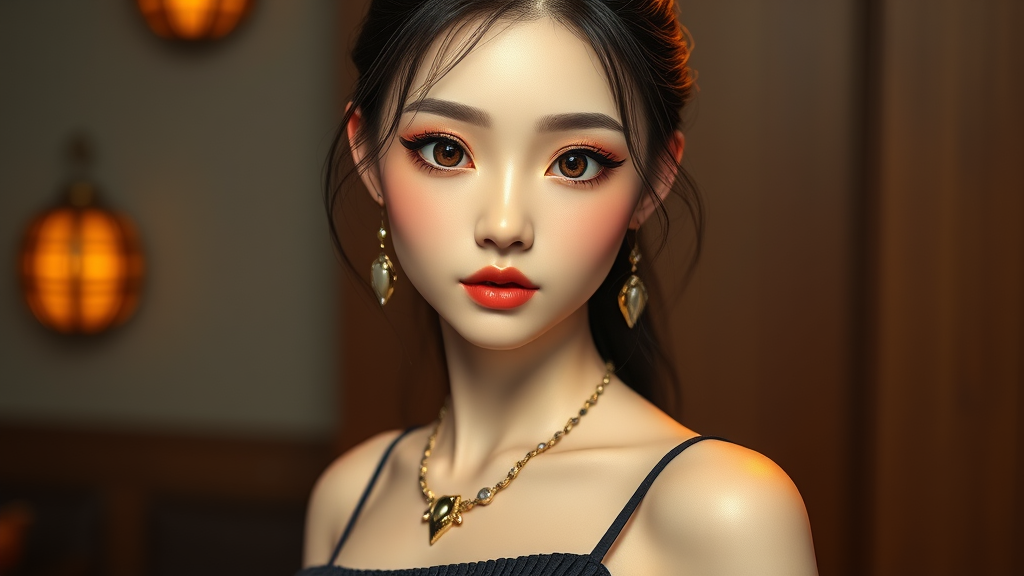 Stunning Korean woman in a stylish black pleated tennis skirt, adorned with symmetrical eyes, depicted in ultra-high resolution with photorealistic 8k hyperrealism. The scene is accentuated by dramatic lighting, resembling professional photography. She is accessorized with elegant jewelry, exhibiting a sophisticated blend of CGI and 3D elements, akin to a finely-crafted doll or octane render. The artistic style captures elements of both cartoon and anime, with a subtle essence of illustration and digital painting. The image is slightly abstract, embracing textural details, a dynamic composition, and the allure of low-resolution vintage effects.