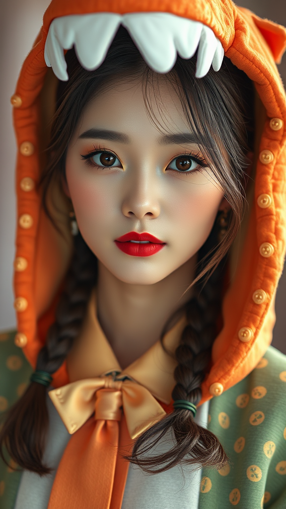 Stunning Korean woman, K-pop idol, dressed in a whimsical dinosaur costume, featuring perfectly symmetrical eyes, ultra high-resolution, hyper-realistic 8k, with dramatic lighting akin to professional photography. The look is complemented by soft red lipstick and elegant jewelry, blending seamlessly with elements of CGI and 3D design. The artistic style marries the lifelike precision of an octane render with the playful elements of a doll, cartoon, and anime-inspired illustration. This digital painting features intricate details and vibrant colors, subtly hinting at a playful theme through a tie adorned with buttons. Despite being rendered in high definition, subtle low-res JPEG artifacts add a nostalgic layer to the composition.