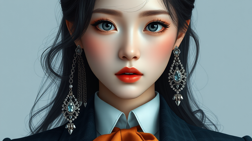 Stunning Korean woman, kpop icon, with perfectly symmetrical features, ultra high definition, photorealism, 8k resolution, hyperrealistic depiction, dramatic lighting, photography, adorned with elegant jewelry, CGI effects, 3D rendered, doll-like aesthetics, octane rendering, cartoon and anime influences, illustration and drawing style, digital artistry, digital painting, textured elements, cropped composition, jpeg nuances, sophisticated attire with ties and buttons, low resolution hints.