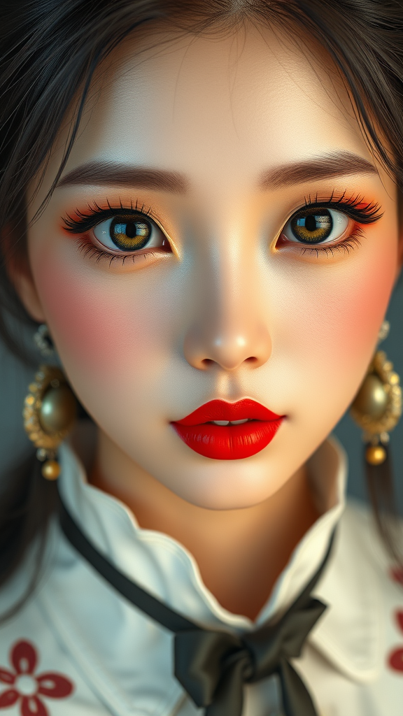 Stunning Korean woman, kpop star, with perfectly symmetrical eyes, captured in ultra high-resolution, photorealistic 8k detail with hyperrealistic studio lighting; the image exudes a photographic allure, highlighted by bold red lipstick and exquisite jewelry. Rendered with cgi and 3D techniques, she presents a doll-like quality, combining elements of cartoon and anime. This illustration showcases digital artistry through a detailed digital painting. Subtle hints of text and a cropped composition bring out textures, while a hint of jpeg artifacts adds a unique touch, balanced by elegant ties and buttons, avoiding any low-resolution distractions.